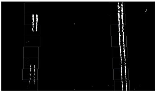 The white pixels in the bird’s-eye view represent the lane outline and the black pixels denote the background information; therefore, it is possible to locate the lane line by obtaining the position of the white pixels. A sliding window is typically used to calculate the number of white pixels in each column of the pixel coordinate system, and the result is shown in Figure 8.