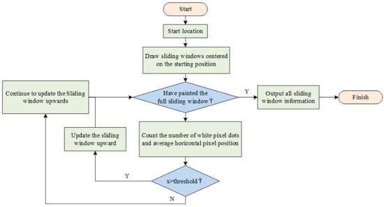 To complete the sliding window lane line positioning, we need to determine the starting point of the lane line. The bird’s-eye view from the bottom to the top represents a gradual distance from the camera. So, the sliding window is used to count the number of white pixel blocks in the window starting from the bottom, and the starting point of the lane line is determined based on the peaks of the number. Then, a new sliding window is drawn centered on the starting point towards the top, and the number of white pixels in the window is counted. The peak value is used as the new starting point to make a new sliding window. Then, the process is repeated to determine the direction of the lane line. The algorithm flow is shown in Figure 9.