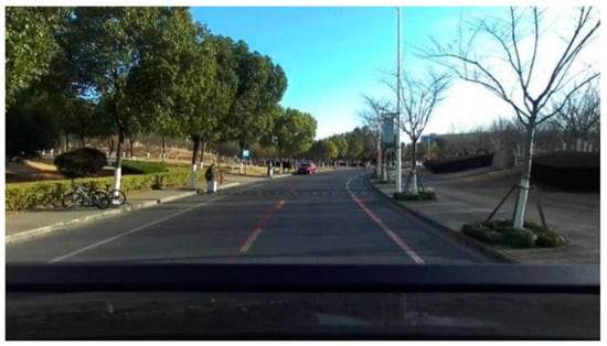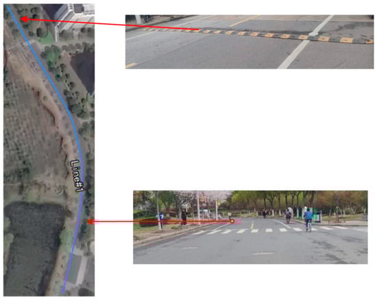The vehicle driving speed was stabilized at 10 m/s, and the total length of the test section was 250 m. After the measurement, the test section entered the curve at the position of 50 m, drove out of the curve after 110 m in the curve, and then had a speed bump at 70 m in the straight road. Figure 20 shows the satellite map of the collected road section and the result of the target-feature labeling.
