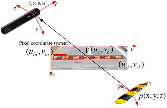 In extracting the speed bump distance, the center position of the target-detection frame was selected as the distance-recognition extraction point because the target-detection frame could contain the speed bump, which was approximately rectangular in shape. If the speed bump was detected, the camera could get the upper-left vertex position (ulu,vlu) and lower-right vertex position (url,vrl) of the detection frame, and the principle is shown in Figure 13. The three coordinate systems from left to right are the camera coordinate system, the pixel coordinate system and the world coordinate system. The center position of the detection frame (uc,vc) is derived from Equations (22) and (23):