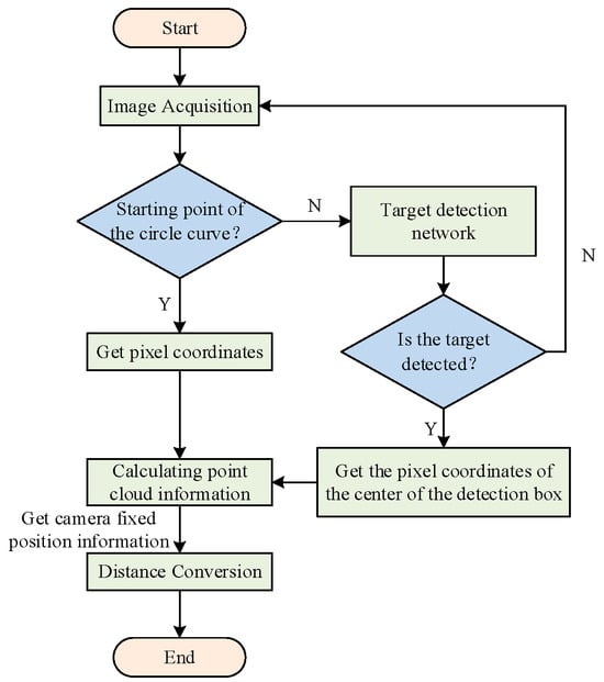 The camera used in this paper was a binocular camera with depth-perception function, which could provide 3D point cloud information of the subject. In extracting the distance of the starting point of the circle curve, since the pixel-coordinate-location identification method of the starting point of the road circle curve has been given in the previous paper, the distance of the starting point of the circle curve could be extracted from the 3D point cloud data of the camera under the condition of the known pixel coordinates. The workflow of this extraction method is shown in Figure 14. If the lane-line circular curve start point is detected, the pixel coordinates are obtained and the point cloud information is calculated. Then, the distance from the target is calculated based on the distance conversion. If the start point is not detected, the lane line is continued to be detected.
