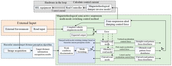 The rest of this paper is organized as follows. System modeling is described in Section 2, including the seven-degrees-of-freedom (DoF) full-vehicle model, the road-surface input model, and the mathematical model of magnetorheological dampers. A target-distance-recognition method based on the binocular camera is described in Section 3. In Section 4, an intelligent-suspension control system is presented. In Section 5, an HIL experiment is performed to illustrate the effectiveness and advantages of the proposed scheme. Finally, the work of the full paper is summarized and the validity of the proposed program is clarified in Section 6.