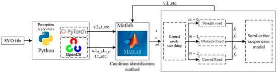 In this paper, the joint simulation was realized by Python and MATLAB/Simulink. The perception algorithm was implemented based on Python3.8, which was the control algorithm. The whole vehicle and road-input model was implemented by Simulink2021a. Python passed to MATLAB2021a the lane-line circle-curve start-point result c, the speed-bump target-recognition result s, the time t, the target-object distance Lt, and other parameters. MATLAB obtained the control-mode-switching parameters m through Simulink with Python’s parameters. The flow is shown in Figure 19.