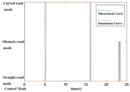 The results of the joint simulation control mode switching are shown in Figure 21. The simulation switching curve was 0.009 s earlier than the theoretical switching curve into the straight-road mode, when the vehicle got out of the curve. The simulation test under the semiactive suspension control mode switched to the obstacle-road mode and was 0.008 s earlier than the theoretical switching curve when the vehicle was about to pass the speed bump target. After the vehicle passed the target of the speed bump, the simulated switching curve of the control method back to the straight-road mode was ahead of the theoretical switching curve by 0.007 s. The reason may be that the vehicle driving speed was slightly higher than 10 m/s, and the theoretical switching curve was calculated as 10 m/s. However, the difference between the simulation and theoretical model was only on the order of milliseconds, which would not affect the switching strategy efficiency.