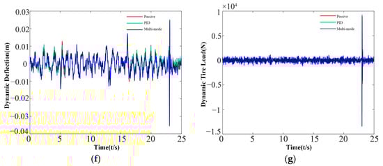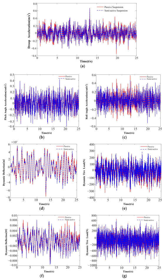Simulation effect: (a) Comparison of the droop acceleration; (b) Comparison of the body pitch-angle acceleration; (c) Comparison of the body roll-angle acceleration; (d) Dynamic deflection of the right rear suspension; (e) Dynamic tire load of the right rear suspension; (f) Dynamic deflection of the left front suspension; (g) Dynamic tire load of the left front suspension.
