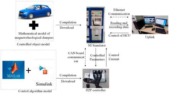 The hardware-in-the-loop experimental test environment constructed in this paper consisted of the D2P (development to prototype), the host computer software (LABCAR-OPERATOR V5.0) and the LABCAR test cabinet(from Vehinfo, Shanghai, China) [33]. The D2P connects and interacts with the host computer through the CAN bus and provides abundant I/O interfaces. The host computer was equipped with MATLAB, LCO, and other software, and the test interface for the host computer could be constructed to detect variables. LABCAR provided the I/O boards and CAN communication boards, which could test the operation effect, transmit the required signals to the host computer, and transmit the simulated signals during the simulation operation. The flow of the test is shown in Figure 23.