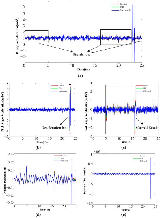 The hardware-in-the-loop test results are shown in Figure 24, the results obtained are shown in Table 4. And the analysis indicated that the root mean square value of body roll acceleration are more significantly improved compared to the pitch and droop acceleration. And the multi-mode control method improves the performance of suspension and tire compared to the passive suspension and PID control methods.