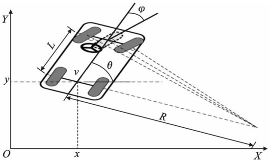 In the formula: x and y represent the coordinates of the vehicle’s rear axle midpoint along the X and Y axes, respectively. v denotes the velocity of the vehicle at the rear axle midpoint. θ represents the orientation angle of the vehicle’s body. R represents the turning radius at the rear axle midpoint, which is determined by the Ackermann steering geometry principle. The formula is as follows: