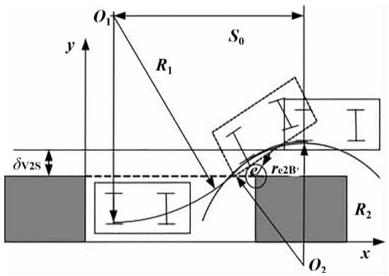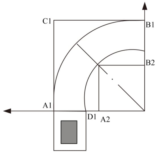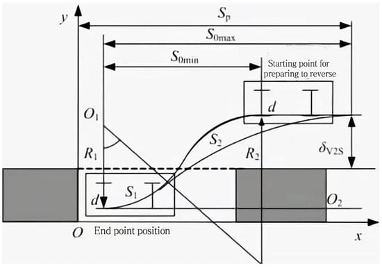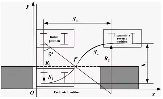 Based on the above formulas, the trajectory of the vehicle while in reverse can be analyzed. The reverse trajectory is formed by connecting the initial position and the final position of the vehicle using two tangent circular arcs, aiming to simplify the reverse maneuver as much as possible, as shown in Figure 6.