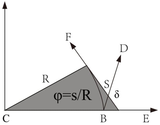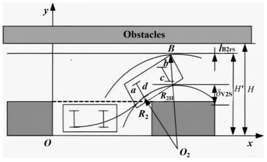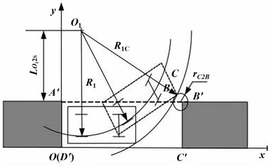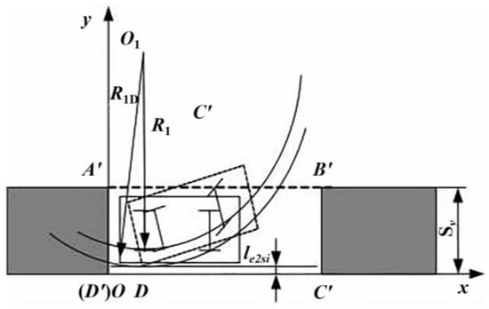 - Based on the collision analysis at the vertex D of the vehicle body, the width of the parking space, Sy, is determined. As shown in Figure 7, the radius of the arc covered by the vertex D of the car is calculated as: