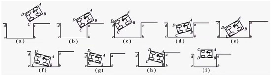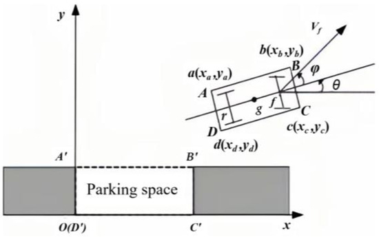 In Figure 5, A′B′C′D′ represents the parking space, ABCD represents the four corners of the vehicle body, and abcd represents the contact points of the four tires. vf denotes the absolute forward speed measured at the front axle center of the vehicle, where positive values indicate forward motion and negative values indicate reverse motion. θ represents the vehicle’s heading angle, with counterclockwise as positive and clockwise as negative. g represents the Ackermann steering angle, with counterclockwise as positive and clockwise as negative.