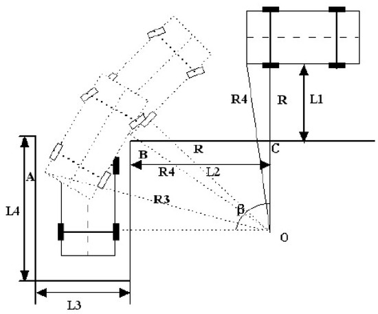 In the low-speed reversing range, without considering tire side slip, the trajectory of the rear wheels at any given moment is primarily determined by the wheelbase, track width, and Ackermann steering angle of the front wheel center point. This is independent of the reversing speed of the vehicle, as shown in Figure 5. We can observe that there is a relationship between the steering angle of the front wheels and the trajectory of the rear wheels during the reversing process [61].