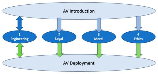 AV technology is ready for deployment when the following four stages of the technology acceptance model (TAM) are completed: engineering, legal, moral, and ethical. They are shown in Figure 2. The engineering stage has bidirectional links, because we have feedback involved in the continuous engineering improvements based on regular evaluations, technology progress, and changes in customer requirements.
