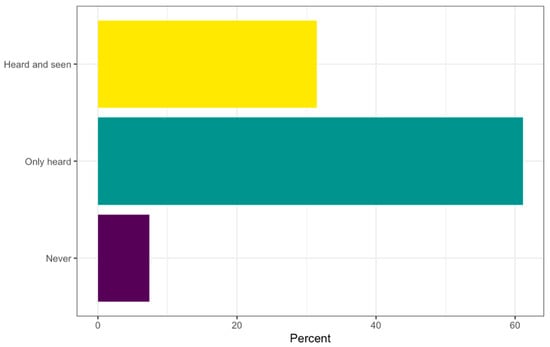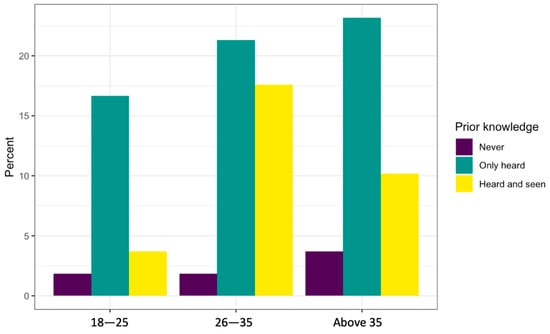 Participants’ responses to the question related to prior knowledge of AVs revealed that the majority of them (more than 90%) have already heard about autonomous or self-driving vehicles before participating in this survey. However, only 30% of respondents have previously seen AVs, as seen in Figure 3. Furthermore, the respondents’ age and level of education serve as the key measures for comparison when examining their AV-related concerns, since these two characteristics were identified as having a significant impact on respondents’ perceptions of AVs, as seen earlier [28]. Therefore, these two factors can be compared to the initial question of the participants’ prior knowledge of AVs.