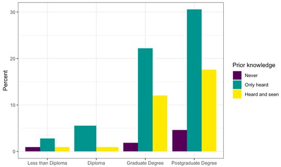 Figure 4 shows the age groups of the participants compared to their prior knowledge of the term “autonomous vehicle”. The above-35 age group had the largest proportion of respondents. However, for the younger age groups, there was a lower proportion of those who had never heard about AVs compared to those who have at least heard of them; those aged 18–25 years comprised approximately 20% of the respondents compared to around 39% respondents in the 26–35-year-old age group who had heard about and/or seen AVs. It is worth noting that the 26–35 age group had the highest subset of those who reported having seen AVs in real life. Additionally, the initial question of the participants’ prior knowledge of AVs can be also compared to their respective highest levels of education. As shown in Figure 5, there is a clear correlation between the level of education and an awareness of AV technology.