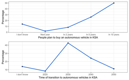 In line with previous questions, respondents were asked to report when they were planning to buy an AV and give their opinions on the timeline for the transition to AV technologies in KSA. Half of the respondents (50%) stated that they plan to buy an AV in 10 years, whereas more than 40% indicated a prediction that 2030 would be the transition year for AVs, as shown on Figure 6. As expected, the year 2030 is aligned with the SA government’s long-term planning for the introduction of intelligent transport and smart cities.