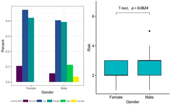 Comparatively, previous research [23,24,25,26] has found that gender might impact consumers’ perceptions. Thus, we include Figure 7 and Figure 8 to display gender comparisons: a bar chart and a box plot along, with an independent samples t-test. In terms of general opinions, there was a clear trend observed among women and men who are more likely to have positive attitudes toward AVs. However, a between-groups t-test showed that significantly more women would expect benefits from this transition than men (t = 2.0629, p = 0.04817), whereas only slightly more women than men would expect fewer risks (t = −1.9295, p = 0.06239); the difference was large enough to be statistically significant at a significance level of 10%.