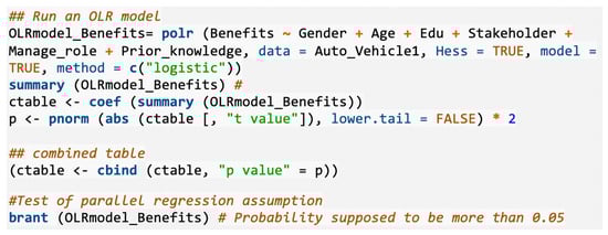 An ordinal logistic regression (OLR) approach was applied to examine significant factors that could help in understanding the level of awareness of AVs in Saudi Arabia. We used the benefit perception of AVs as a dependent variable, and this is defined through the benefit responses seen from the transition to increased use of AVs. OLR is a widely used classification method with several key advantages. Firstly, OLR is useful when the dependent variable is classified into three or more ordered categories. For example, the benefits of adopting autonomous technology in this study, with a 5-point Likert scale, is a perfect context for the application of the OLR method. Secondly, the OLR method does not need to assume equal intervals between scoring categories, unlike other regression models. Thirdly, the OLR method includes the ranking information in the dependent variable when returning the information on the contribution of each independent variable based on the cumulative-odds principle. Note that the interpretation of an estimated regression slope for OLR is somewhat complex. It is considered to be one of the most respected methods in the field of data analytics.