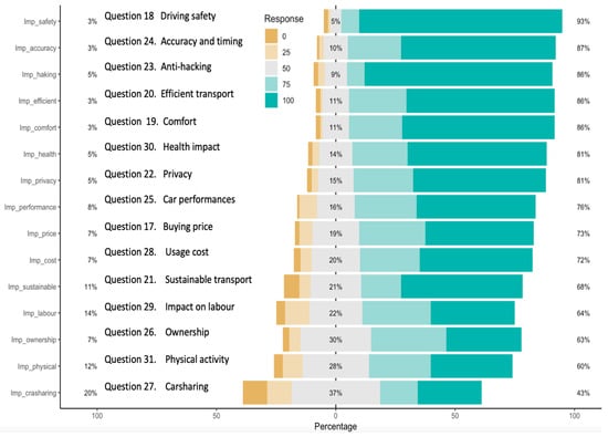 A summary of all the responses to questions 17–31 is shown in Figure 10. The cumulative percentages for the two highest responses on the Linkert scale of 1–5, i.e., 0, 25, 50, 75, 100, are given in Figure 10. We can see that perceptions of safety, addressed in question 18, is the most important factor, accounting for 93% of the responses. Following safety are accuracy of driving, security in terms of anti-hacking measures, efficiency, comfort, health, privacy, and performance. The price of new technologies and the costs of using an AV are next on the scale. These factors are having a negative effect on peoples’ decisions to accept these new technologies and invest in cars with higher levels of automation. Because we have a synergy of two transitions happening now, the transition to wider use of EVs and the transition to wider use of AVs, it is interesting to note that the costs of buying new EV is still higher, but the maintenance and usage costs are lower. Further developments in AV and EV technologies will bring them together and will drive prices and the usage costs down. Since we are conducting longitudinal surveys which repeat on regular bases, it will be interesting to see those two factors in future investigations. Sometimes, like in the EU, governments provide support, subsides, tax relief, etc., to buyers of new EVs [41], but not for new AVs. It is obvious that the use of EVs have a positive impact on the environment, bringing sustainable transport—if the energy used is green. Apart from support for customers to buy EVs, the Chinese government offer subsidies to manufacturers to encourage them to produce electrical vehicles [42]. The aim is to broaden the utilisation of sustainable transport and increase social welfare.