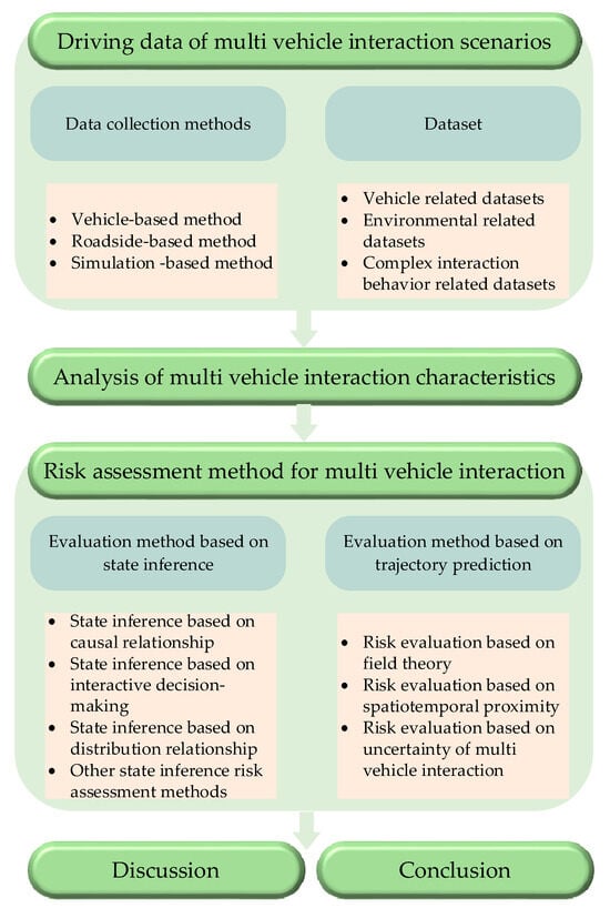 The remaining content of this article is arranged according to the following structure. The data collection methods for multi-vehicle interaction scenarios are introduced in Section 2. The mechanism of multi-vehicle interaction is described in Section 3. The risk assessment methods for two-vehicle interactions and multi-vehicle interactions are summarized and discussed, respectively, in Section 4. Challenges and future research directions are presented in Section 5. Section 6 concludes this paper. Figure 1 depicts the flowchart outlining the structure of this paper.