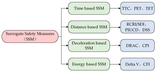The risk of two-vehicle interaction can be quantified in terms of vehicle proximity and collision avoidance intensity [22], based on which many scholars have established a series of Surrogate Safety Measures (SSM) to evaluate the risk of two-vehicle interactions [23]. SSM can be mainly divided into four subcategories, namely time-based SSM, distance-based SSM, deceleration-based SSM, and energy-based SSM, as shown in Figure 2.