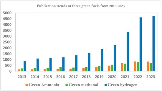 Comparative analysis of the literature on green hydrogen, green ammonia, and green methanol during 2013–2023 (Source: Scopus.com).