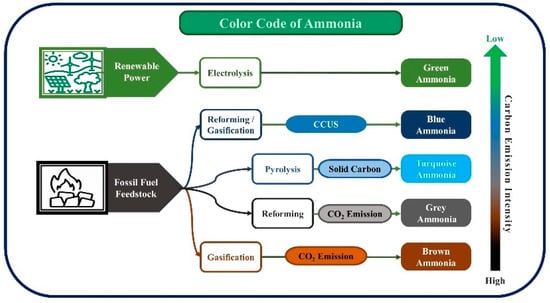 Ammonia is often associated with color codes to indicate its production methods, which help to distinguish between different ammonia types [,]. Commonly recognized color codes include (Refer to Figure 3):