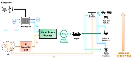The production of green ammonia is a process that involves using renewable energy sources to make ammonia from water and air without emitting any carbon dioxide []. The Fritz–Haber process, also known as the Haber–Bosch process, produces ammonia from nitrogen and hydrogen gases. It is one of the most important industrial processes in the world, as ammonia is used to make fertilizers, explosives, and other chemicals. The production, storage, and transportation steps of green ammonia are illustrated in Figure 4.