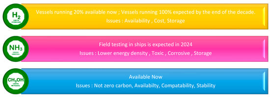 Based on several literature reviews, a recent study meticulously examined three distinct E-fuels—power-to-methane (PtCH4), power-to-methanol (PtCH3OH), and power-to-ammonia (PtNH3)—and drew insights for clean energy transition []. Another study extensively explored the green fuel pathway, emphasizing the decarbonization of the shipping sector through environmentally conscious production methods of hydrogen, ammonia, and methanol []. In another study, an in-depth analysis focusing on key considerations such as emissions, supply, safety, and storage, tailored explicitly for achieving zero-emission shipping, was conducted []. Furthermore, the crucial role of carbon-neutral fuels in steering toward a net-zero future was also discussed [].