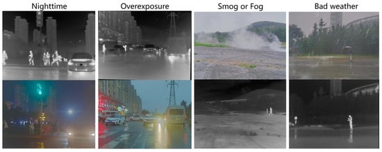 Researchers in the field of computer vision have always been interested in pedestrian detection since it is a crucial approach for many applications, including intelligent robotics, naturalistic driving, autonomous driving, and intelligent transportation systems (ITSs) [1,2,3,4]. For good illumination conditions, desirable pedestrian detection performance can be achieved using many existing methods [1] which use a visible (VI) image as input. In contrast, it is quite challenging to achieve robust performance for adverse illumination conditions, such as nighttime, low light, total darkness, shadows, and overexposure, as shown in Figure 1. Since the VI cameras rely on good lighting conditions in the environment, they tend to capture low-quality images when lighting is poor. According to the National Highway Traffic Safety Administration (NHTSA) Fatality Analysis Reporting System (FARS), the majority of pedestrian fatalities due to traffic accidents occur in harsh lighting scenarios, such as nighttime and bad weather [5]. Therefore, this work focuses on improving the effectiveness of pedestrian detectors in low-light conditions. Combining multispectral images (visible and infrared images) has proven useful for robust pedestrian detection in ADAS applications [6,7,8,9,10,11,12,13,14,15,16,17,18,19,20,21]. The signals of visible and infrared images originate from different modes and can provide scene information from different aspects. Visible images capture reflected light, while infrared images capture thermal radiation. Therefore, this combination is more informative than the combination of single-modal signals. Visible images typically have high spatial resolution, considerable detail, and light–dark contrast. Therefore, they are suitable for human visual perception. However, these images are easily affected by harsh conditions such as poor lighting, fog, and other adverse weather effects, as shown in Figure 1. Infrared images are resistant to these interferences but typically have low resolution and poor texture. Therefore, the fusion of visible and infrared images can improve the performance of object detection in harsh environmental conditions due to the universality and complementarity of the images utilized. However, it is difficult for multimodal pedestrian detectors to adapt to the changing environment. The detection performance is likely to be stuck when the actual application illumination conditions are different from the illumination conditions of the experiment data.