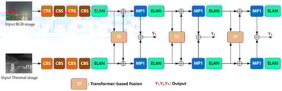 Framework of the proposed TF-YOLO. The backbone of TF-YOLO includes a two-stream feature extraction network and three transformer–fusion modules. The head of TF-YOLO has three outputs: Y1, Y2, and Y3.