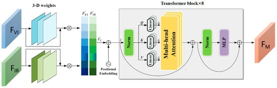 Figure 3 displays the architecture of our developed transformer–fusion module. By using the RGB feature map and the thermal feature map as inputs, the proposed transformer–fusion module creates the multi-modal fusion feature map . We first perform 3-D attention weights for the input feature maps to enhance the feature representation capabilities. In particular, the inputs and are fused with themselves via a dot product after passing through 3-D weights, respectively. Subsequently, the flattened features and are concatenated along the channel dimension to produce the feature vector . After that, a learnable positional embedding is added with to generate the input which will then be sent to the transformer blocks. The positional embedding can encode the position information into which helps differentiate spatial information between different tokens at training time. The transformer module consists of 8 transformer blocks, each with two normalization layers, a multi-head attention mechanism, and an MLP which consists of a two-layer fully connected feed-forward network with a GELU activation [26].