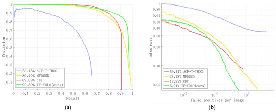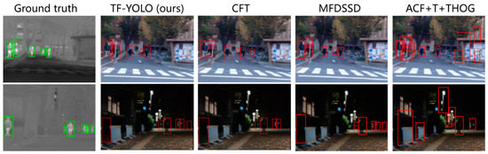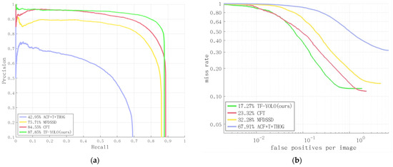 The performance of the proposed TF-YOLO is evaluated by comparing it with three other approaches, including ACF + T + THOG [6], MFDSSD [13], and CFT [24]. Figure 4 presents the precision–recall curves and miss rate versus FPPI curves, respectively. It can be observed that our approach obviously outperforms all other methods and achieves the highest AP of 86.56% and the lowest MR of 17.27%, which evidently outperforms the state-of-the-art results of CFT. Furthermore, the performance gap is quite large when compared with MFDSSD [13] and ACF + T + THOG, with 87.85% AP of ours versus 75.71% AP of the MFDSSD and 42.95% AP of the ACF + T + THOG, respectively. The proposed method is dramatically superior to all other methods, which demonstrates that the proposed transformer–fusion module can significantly improve the accuracy of pedestrian detection with bad illuminations. The results of our method outperform all other techniques, which makes sense because the M3FD is taken under environments with low visibility and bad weather, and the proposed transformer–fusion mechanism can dramatically increase the detection accuracy of different illumination and weather conditions.