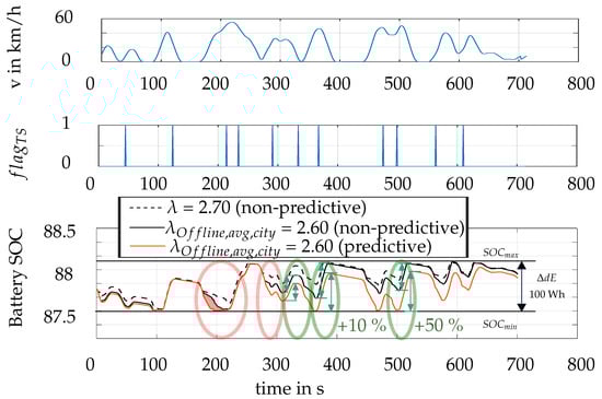 - In [33], velocity prediction at intersections considering traffic signal (TS) state and traffic flow leads to an improvement of 0–2% compared to the non-predictive Online ECMS.