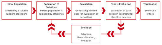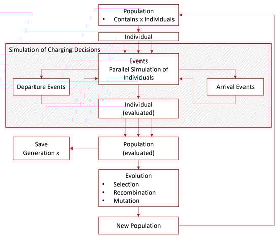 To investigate the need for charging infrastructure in Berlin, the charging decisions of agents based on the MATSim output and certain infrastructure scenarios are simulated. The resulting data are used to optimize the infrastructure scenarios, using a genetic algorithm (GA) with multi-objective optimization (MOO). To optimize the quantity and the distribution of charging infrastructure, in the first step, it is necessary to define an optimization problem with suitable optimization criteria and choose an optimization method (p. 517 f. in [16]). Furthermore, an electric vehicle population is required, considering the real distribution of vehicle classes in Berlin and Brandenburg. Moreover, a GA needs a starting population of solutions to start the optimization. The starting population can have a high influence on the optimization process and should be appropriate for the optimization problem. Figure 1 shows a principal visualization of the genetic optimization procedure.