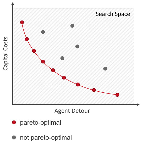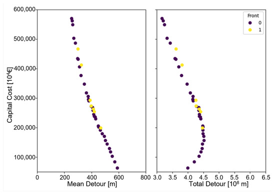 For the problem at hand, multi-objective optimization is used. MOO allows us to find any number of optimal solutions in relation to the criteria used. This results in solutions with very high capital costs and low agent detours and vice versa, with other Pareto-optimal solutions in between. Specifically, one solution of the described optimization is a specific distribution of charging infrastructure across the area of the city of Berlin. The solutions contain the number of charging points, their charging powers, and their locations. MOO can optimize according to multiple criteria at the same time, and a weighting of the criteria is not necessary. A Pareto-optimal solution dominates other solutions and is not dominated by other solutions. Domination means that a solution is at least equal in all objective function values and better in at least one objective function value than the solution it is compared with [16]. To evaluate the most suitable Pareto-optimal solutions for the present use case, further information, which is not considered during the optimization of the GA, must be included. This shows that it is reasonable to find many solutions distributed over the whole search space. Figure 2 shows an example of a front of Pareto-optimal solutions in relation to the criteria chosen for optimization.