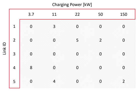 The creation of a starting population is crucial for running a genetic algorithm [16]. It is the first population of solutions that the optimization starts with. The results shown in this paper are from a simulation with a population size of 20 solutions. Since the population size does not change over the generations, it is necessary to create a starting population with 20 solutions or 20 different charging infrastructure scenarios. The initial charging infrastructure scenarios are created in a random procedure. Figure 3 shows an exemplary illustration of a solution of the GA. One solution represents one distribution of the charging infrastructure, and each link in the network represents a gene that can be modified by the GA in terms of the number or power of charging points.