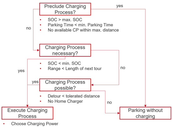 To determine when the agents decide to charge their vehicle, a charging decision model is necessary. This is derived from the charging decision model in Figure 4 [17] Before the decision model is used, it is checked whether the agent is at his/her home link and has a home charger. If this applies, the agent charges the vehicle with a power of 11 kW. This charging power seems to be suitable for home charging, considering the longer standing times. Moreover, in Germany, the installation of a wall box with up to 11 kW charging power does not require registration with the local network operator [32]. If the agent does not charge at home, the charging decision model is applied. At first, it is checked whether the charging process can be precluded. Therefore, the detour to the next available charging point is determined. If there is an available charging point at the arrival link, the detour is set to zero. Otherwise, it is calculated as described in Section 3.1.3. The charging process is precluded if there is no available charging point within the maximum distance, the parking time is less than the minimum parking time, or the SOC of the vehicle is higher than the maximum SOC that the vehicle can be charged up to. These limits have to be set by the user before the start of the algorithm. If one of these criteria applies to the situation, no charging process is executed. Otherwise, the necessity of the charging process is checked. A charging process is necessary if the SOC falls below the minimum SOC or the range of the vehicle is less than the length of the next tour of the agent. In this case, the agent charges his/her vehicle. If a charging process is not necessary, it has to be decided whether the charging process is possible. A charging process is possible if the detour falls below the tolerated distance set by the user or if the agent does not have a home charger. If this applies, the agent also charges his/her vehicle. Otherwise, he/she parks without charging.