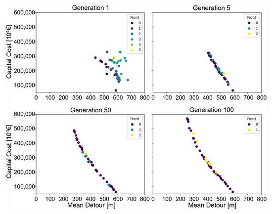 The color of the data points indicates the front of solutions to which a solution was assigned. Front zero means that the solution was non-dominated or Pareto-optimal. Generation one showed the influence of the randomly created starting population. Only a few solutions were assigned to front zero. Furthermore, there were more fronts of solutions compared to the later generations. This means that there were more unsuitable solutions, which were dominated by one or more other solutions. After five generations, the functionality of the algorithm was already visible. Many of the dominant solutions were sorted out. This resulted in fewer fronts of solutions and more solutions in front zero. After 50 generations, the algorithm tried to reduce the mean detour of the agents, whereas the minimum capital costs remained the same. Notably, the solution with the lowest capital costs remained consistent across all generations. This means that no cheaper solutions with a comparable mean detour were found. Moreover, the crowding distance mechanism of the NSGA-II prevented this solution from accidentally becoming lost by preferring edge solutions. Additionally, this mechanism ensured that the solutions were well distributed over the search space. The last generations contained only two different fronts. Most of the solutions were situated in front zero. These solutions became the potential solutions to the optimization problem. Figure 7 shows more details of the development of the key values of the solutions.