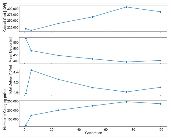 The values refer to the mean value of all 40 solutions of a generation. Firstly, the algorithm started to sort out expensive and non-optimal solutions. This resulted in lower capital costs and fewer detours, although the solutions contained more charging points. It is interesting that the average mean detour decreased, whereas the average total detours increased. This can be explained by the fact that solutions with few charging points or inappropriate spatial distribution of charging points were sorted out. In those solutions, fewer charging processes were executed because there was often no charging point available for the agents. No charging process also means no detour. Therefore, the mean detour decreased due to better distributed charging infrastructure, whereas the total detours increased due to a higher total number of charging processes. In generation one, 700,000 charging processes were executed compared to 900,000 charging processes in generation five. The development from generation 5 to generation 75 showed a continuously decreasing mean detour and total detours, whereas the number of charging points and the capital costs continuously increased. This development was inverted from generation 75 to 100 since the number of charging points slightly decreased.