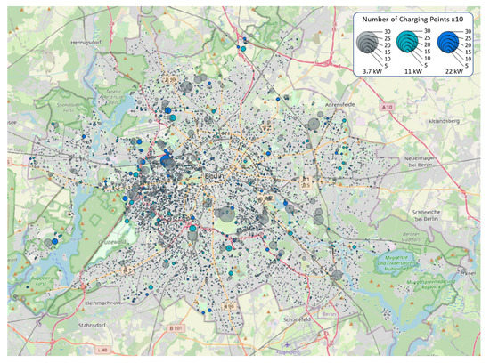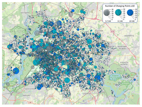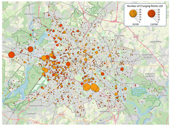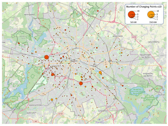 The capital costs of this solution amounted to EUR 5.7 billion and the share of fast charging infrastructure was the highest among the compared solutions at 14.2%. Among the normal charging powers, the proportions were nearly equal. Moreover, this solution showed an increase in the number of executed charging processes, with a total of 1,246,130. However, this increase was small compared to the difference between the bottom-edge and mid-front solutions. In contrast, the temporal occupation rate of the charging infrastructure dropped to 29.07%. The mean SoC after the last trip was 72.11%, which was slightly above that of the mid-front solution. Furthermore, in the top-edge solution, 33,720 agents reached an SoC of zero percent, of whom 23,750 resided in Brandenburg and 10,150 in Berlin. In addition, in this solution, the average length of the journeys in which the agents ran out of energy was nearly the same as in the other solutions. The mean value was 62.0 km and the median was 54.5 km. The total covered distance of these agents amounted to 197 km, on average, and the median was 188 km. Moreover, the spatial distribution of the charging infrastructure was investigated and is shown in Figure 11. It can be stated that in this solution, nearly the whole urban area of Berlin was well covered by the charging infrastructure including the edge districts, where there were no supply gaps. A slight dominance of the western part of Berlin was observed. The tendency for bigger clusters of fast charging points to appear near hospitals, big parking spaces, or train stations near urban highways was also confirmed in this solution.