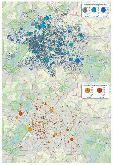Over the last decade, air pollution in cities and greenhouse gas (GHG) emissions continued to increase worldwide. To slow down this development and reduce the negative impact on human health and global warming, governments, particularly those in industrialized countries, are seeking technological solutions to reduce their overall GHG emissions. One of the biggest emitters of pollutants and GHGs is the motorized individual transport industry [1]. The European Union has continuously tightened the emission limits for the transport sector since the introduction of the Euro 1 exhaust emission standard in 1992 [2]. Furthermore, the German government aims to reduce GHG emissions in the transport sector by 2030 by 40% compared to 1990 [3]. To reach this goal, alternative power train concepts are needed. Therefore, the German government focuses on the promotion of electric mobility. The preferred strategy for the private transport sector is the deployment of battery electric vehicles (BEVs). The Climate Protection Program 2030 of the German government constitutes, inter alia, objectives for the expansion of charging infrastructure in Germany. It is assumed that there will be approximately ten million BEVs in Germany by 2030. To supply these vehicles with the necessary electric energy, one million charging points should be erected. According to these assumptions, a ratio of vehicles to charging points of 10:1 would be appropriate [4]. These plans show that the expansion of charging infrastructure is crucial for the transition to electric mobility. However, it remains difficult to determine an exact number of necessary charging points and power due to diverse variables: technical factors such as charging time, which, in turn, is determined by the battery capacity of the car, state of charge of the battery, and available charging power, as well as non-technical factors such as the charging behavior of users.