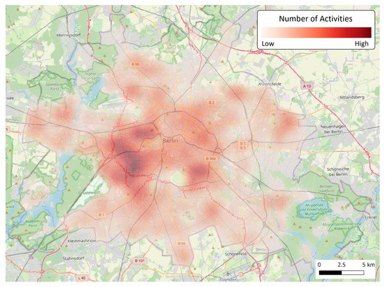 The results of the 100th generation showed charging infrastructure scenarios that had between 112,040 and 379,690 charging points. Charging points with a power of 3.7 kW had the biggest share, with 36.5%, on average, whereas the average share of charging powers of 11 kW and 22 kW was 26.6% and 26.1%. The share of fast charging infrastructure amounted to 10.1%, on average, and was distributed equally for 50 kW and 150 kW. The capital costs were between EUR 624 million and EUR 5.7 billion. Furthermore, the average detours of agents were from 254 m to 590 m across all solutions. Moreover, all solutions were able to cover the energy requirements of most of the agents within the investigated scenario. The highest share of agents that ran out of energy was 3.05%, whereas the lowest share was 2.52%. The investigation of the spatial distribution of the charging infrastructure showed that the solutions prevailed when the charging infrastructure had a similar spatial distribution to the activities of the agents in the MATSim scenario. The distribution of activities is shown in Figure 12. The summarized results are discussed below, together with the used methodology.