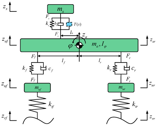 We refer to the half vehicle model built by Shen in 2021 [28]. Figure 1 shows the half vehicle model built for this study; this seven-degree-of-freedom model takes into account the vertical and pitch movements of the vehicle’s sprung mass and the vertical vibration of the seat. This study was carried out with the vehicle unloaded, therefore, the mass and inertia of the driver are not taken into account.