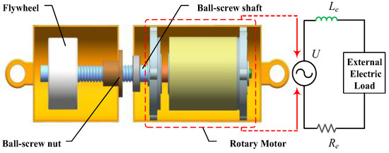 The inerter is a mass element at both ends, and its output force is proportional to the relative acceleration at both ends. Inerters are available in ball-screw, rack and pinion, and fluid types. In this study, we have designed a ball-screw mechatronic inerter. The ball-screw mechatronic inerter comprises a rotary motor device and a ball-screw inerter. Among them, the ball-screw converts the linear reciprocating motion into a rotary motion and transmits it to the rotary motor. Figure 2 shows the working principle of the ball-screw mechatronic inerter.