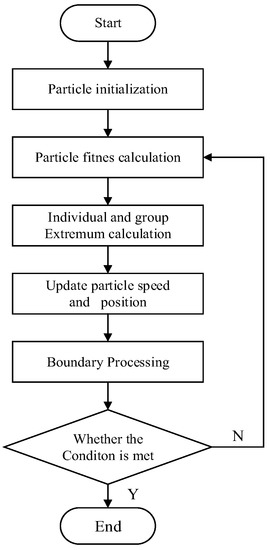 where is the inertia factor, V is the velocity of the particle, X is the particle’s position, n is the iterations number, and d1 and d2 are non-negative constants. The random numbers r1 and r2 usually have a value between 0 and 1, while Pid and Pgd are the individual extremum and global extremum. Figure 4 shows the optimization process of the algorithm.