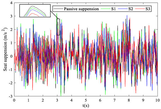 Table 3 shows that, for the S1 seat suspension layout, the RMS values of the seat acceleration and the pitch acceleration decreased by 2.51% and 1.67%, respectively. The improvements are not obvious. Therefore, as the transfer function of the external electrical network increases in order, the RMS values of the seat acceleration and the pitch acceleration of the S2 seat suspension layout are further reduced by 4.58% and 3.41%, respectively. Then, for the S3 seat suspension layout, which used a bicubic transfer function electrical network, the RMS values of the seat acceleration and the pitch acceleration decreased by 10.56% and 7.57%, respectively; this resulted in a significant improvement in the ride comfort of the vehicle seat suspension. A comparison of the time domain characteristics of the seat acceleration and the pitch acceleration are shown in Figure 6 and Figure 7. Figure 8 and Figure 9 show the comparisons of the RMS values of the seat acceleration and the pitch acceleration at different speeds.