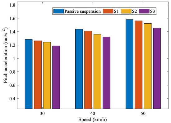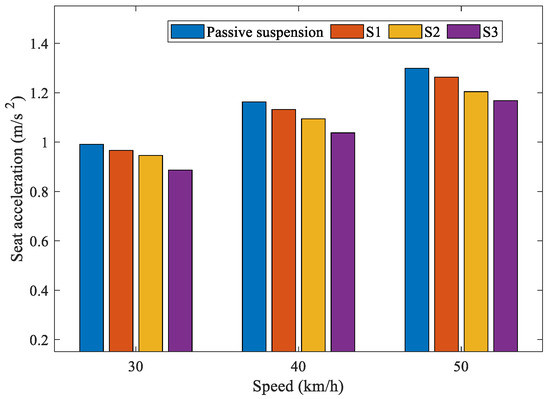 It is noted that, as the vehicle speed increases, the RMS values of the seat acceleration under the same suspension structure also increase. Under the same vehicle speed, the higher the transfer function order is, the smaller the RMS values of the seat acceleration are. For the pitch acceleration, as can be seen in the bar chart, when the speed of the vehicle increased, the pitch acceleration under the same type of suspension also increased. As the order of transfer function of the external electrical network increased, the pitch acceleration was reduced. In conclusion, the RMS values of the seat acceleration and pitch acceleration of the S3 layout are significantly lower than those of the S1 and S2 layouts, and passive suspension.