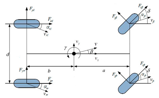 where is the vehicle mass; and are the distances from the vehicle’s center of mass to the front and rear axles, respectively; is the wheel pitch; , and are the longitudinal speed, lateral speed and yaw rate of the vehicle, respectively; , , and are the longitudinal forces of the left front wheel, right front wheel, left rear wheel and right rear wheel, respectively; , , and are the lateral force of the left front wheel, right front wheel, left rear wheel and right rear wheel of the vehicle, respectively.