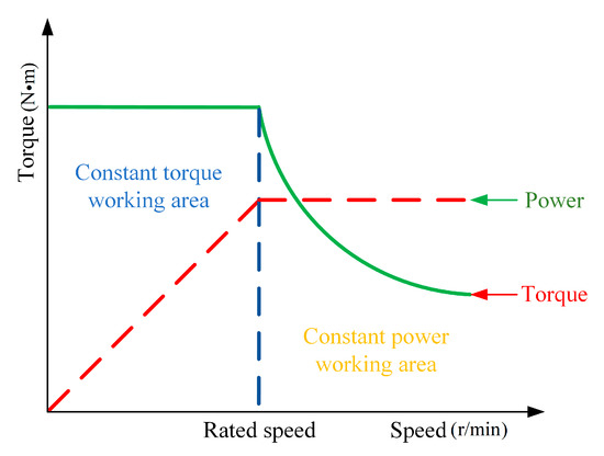 Accurate motor modeling can better reflect the dynamic response of the vehicle. Since this paper mainly studies the vehicle stability control after the failure of the distributed electric vehicle drive system, without considering the internal structure of the motor, it is only necessary to establish a motor model that can meet the reaction characteristics. According to the external characteristics of the motor, a constant torque output is generally maintained at a lower speed, and a constant power output is maintained when the rated speed is exceeded, namely, a low-speed constant torque output and a high-speed constant power output. The external characteristic curve of the motor is shown in Figure 3.